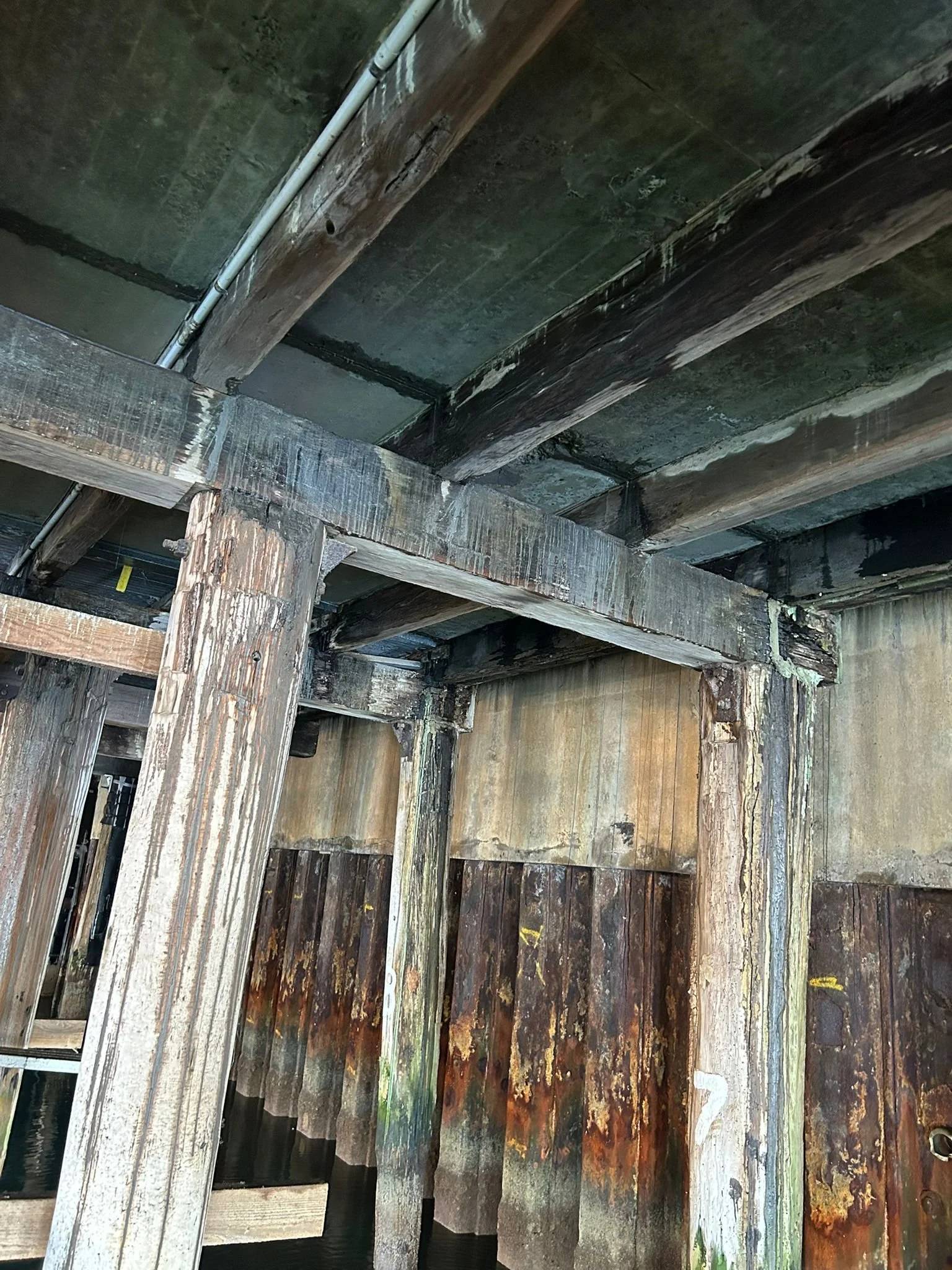 Areas of the existing pier had been assessed and although the concrete looked sound, the timber bearers supporting the concrete on bondeck slab required attention to ensure they could support the plant and equipment working on the pier.