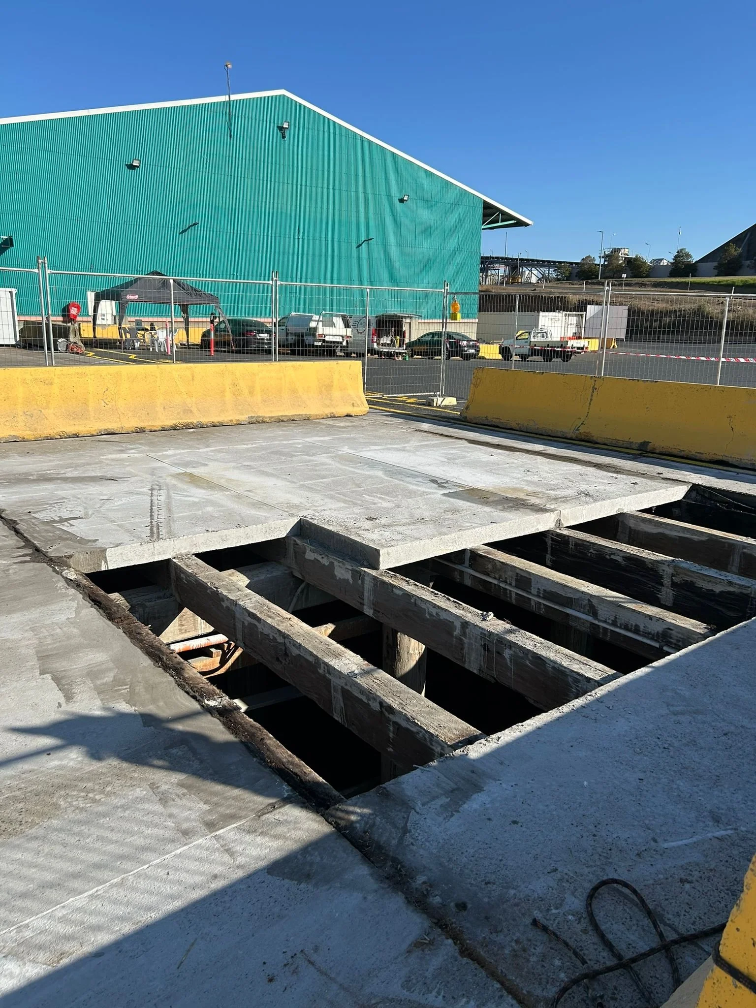 Our operator was on site with a road saw, hand saw and ringsaw to cut through a 150mm thick slab, cutting it into blocks that would be supported by the existing bearers until they were hooked up and removed using a crane and lifting plates.