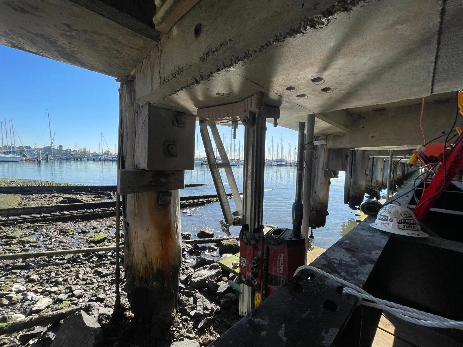 Accelerated is assisting Duratec with the works by drilling inverted holes in the concrete head stocks under the pier, these are to temporarily support steel beams that will be permanatly fixed inplace once the new piles are driven through them.